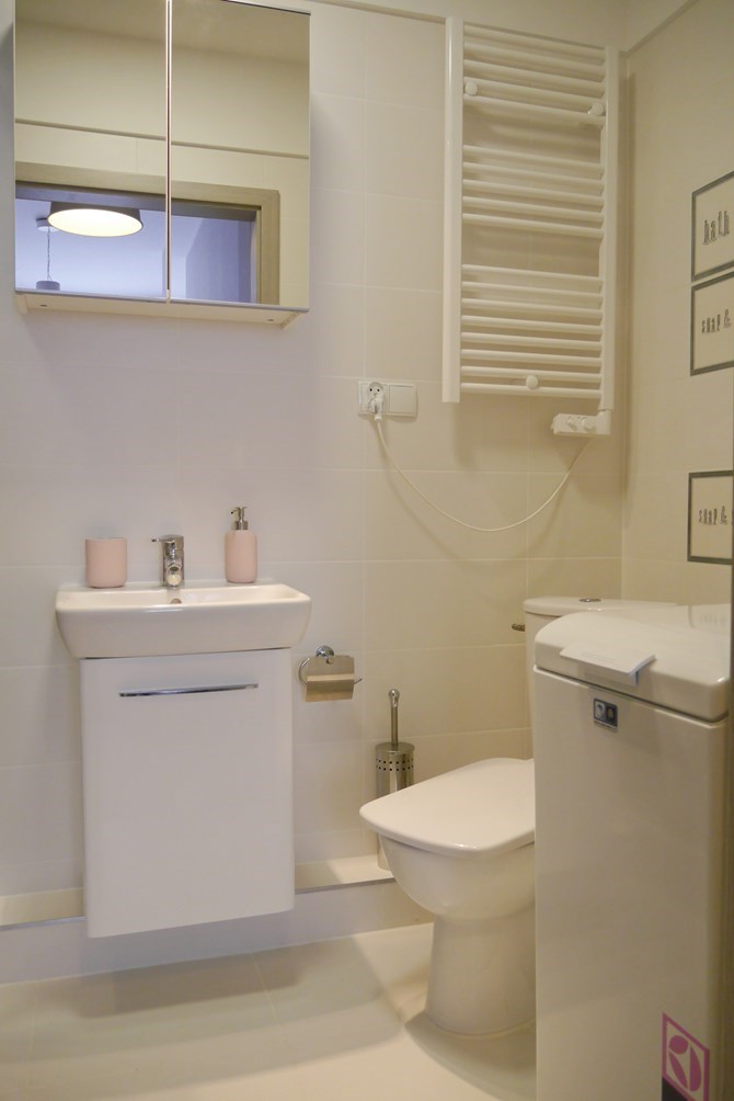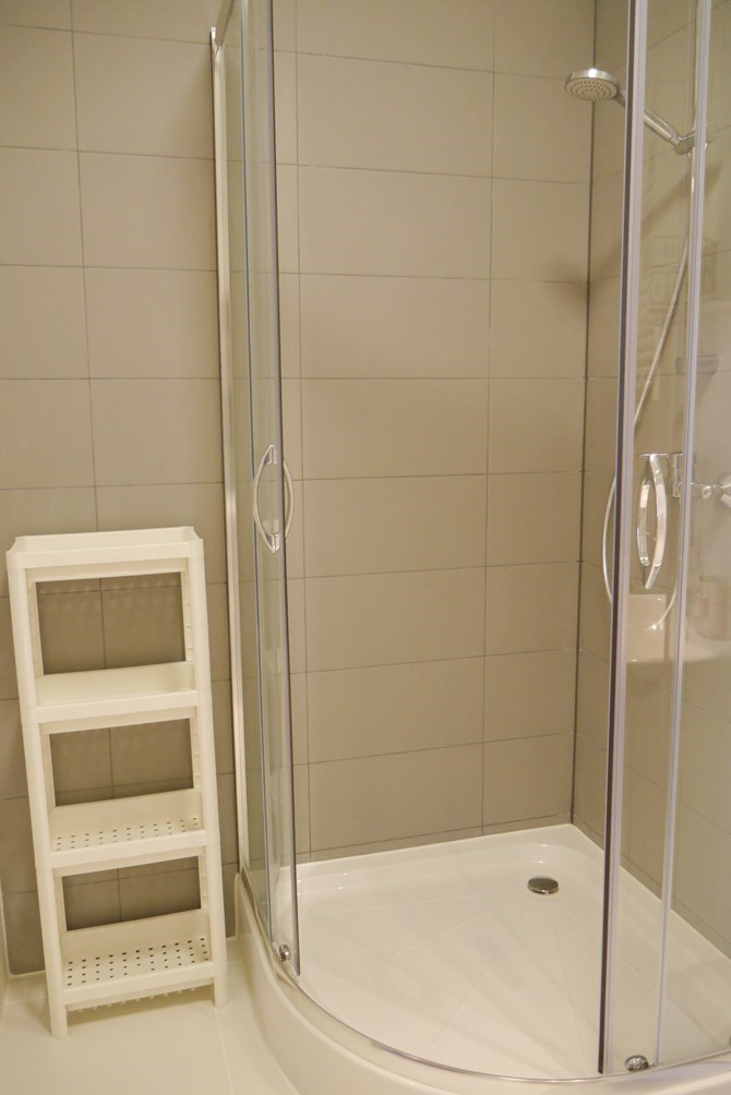 Łazienka jest wyposażona w kabinę prysznicową, pralkę, WC, umywalkę lustro oraz szafkę.