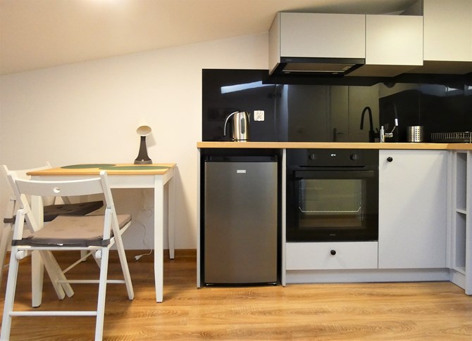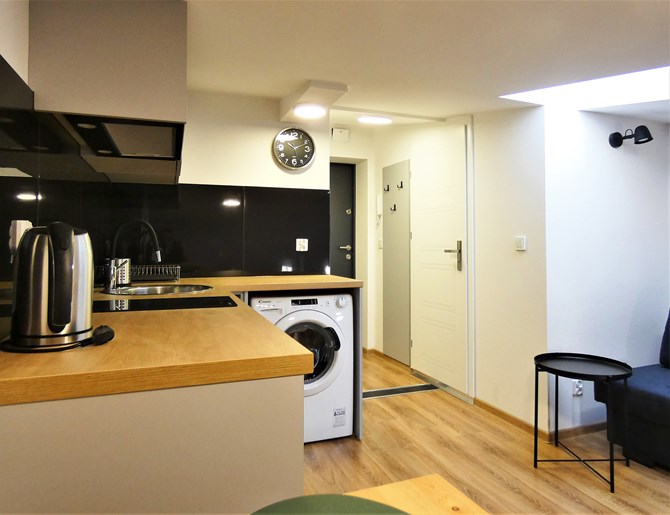 Pokój z aneksem: szafki kuchenne, lodówka, pralka, dwupalnikowa płyta indukcyjna, zlewozmywak, rozkładana kanapa, komoda, stolik, krzesła, szafa.