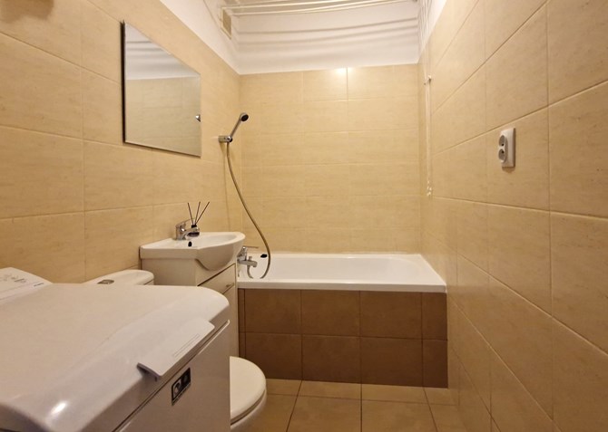 Łazienka z WC: wanna, pralka, umywalka, lustro, szafki.