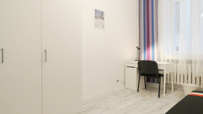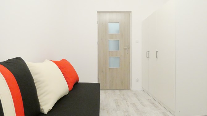 Pokój: kanapa, biurko z krzesłem, pojemna szafa.