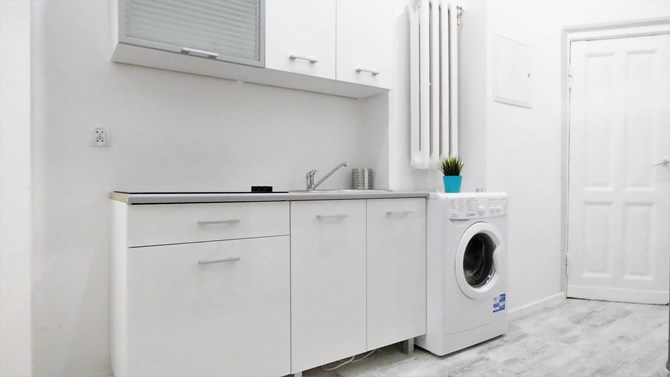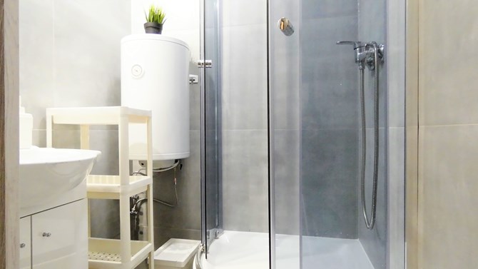 Łazienka: kabina prysznicowa, umywalka z szafką, pralka, WC.