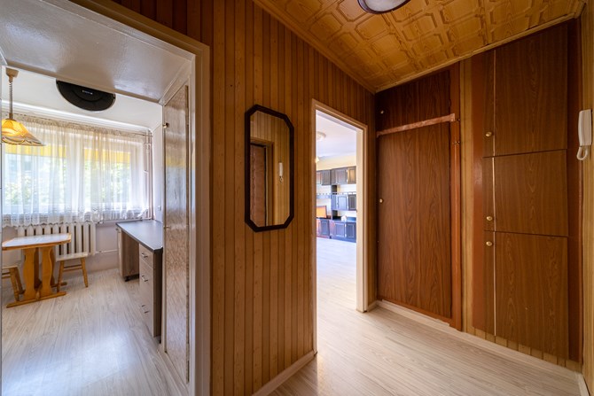 Przedpokój: szafa, regał, lustro.