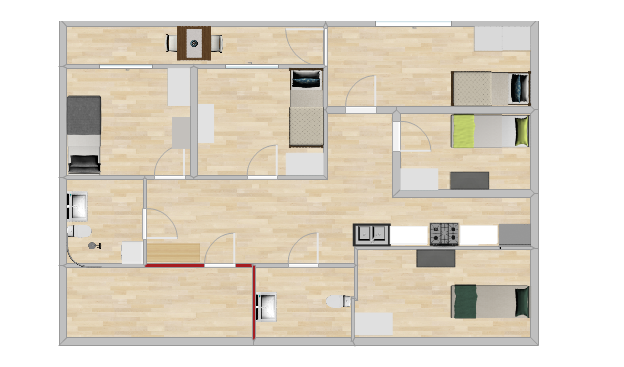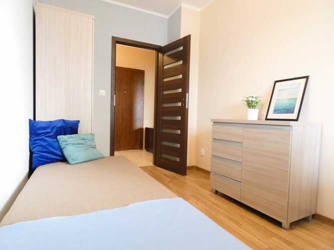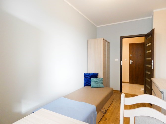 Pojedynczy pokój w mieszkaniu z częściami wspólnymi.