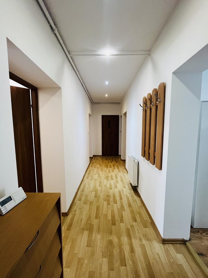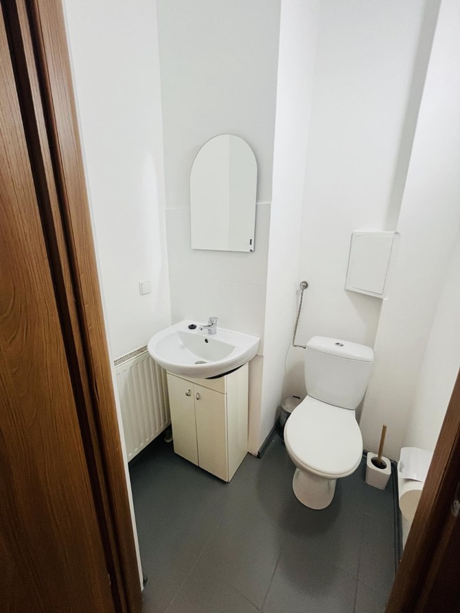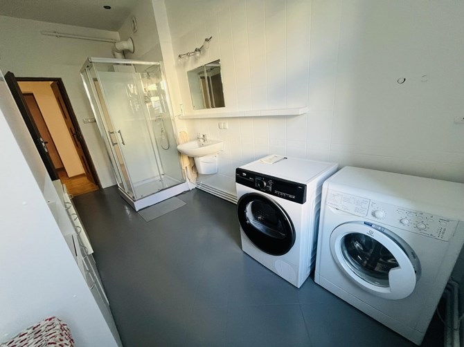 Łazienka: kabina prysznicowa, umywalka, pralka oraz WC. Osobna toaleta z WC oraz umywalką.