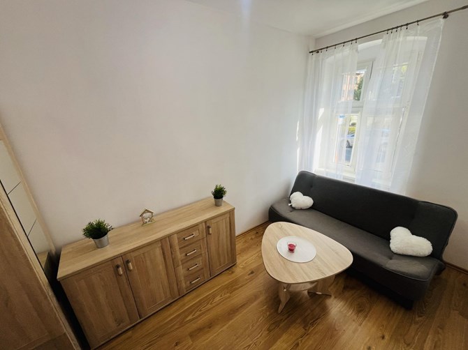 Pokój: rozkładana kanapa, szafa, stolik oraz pufy.