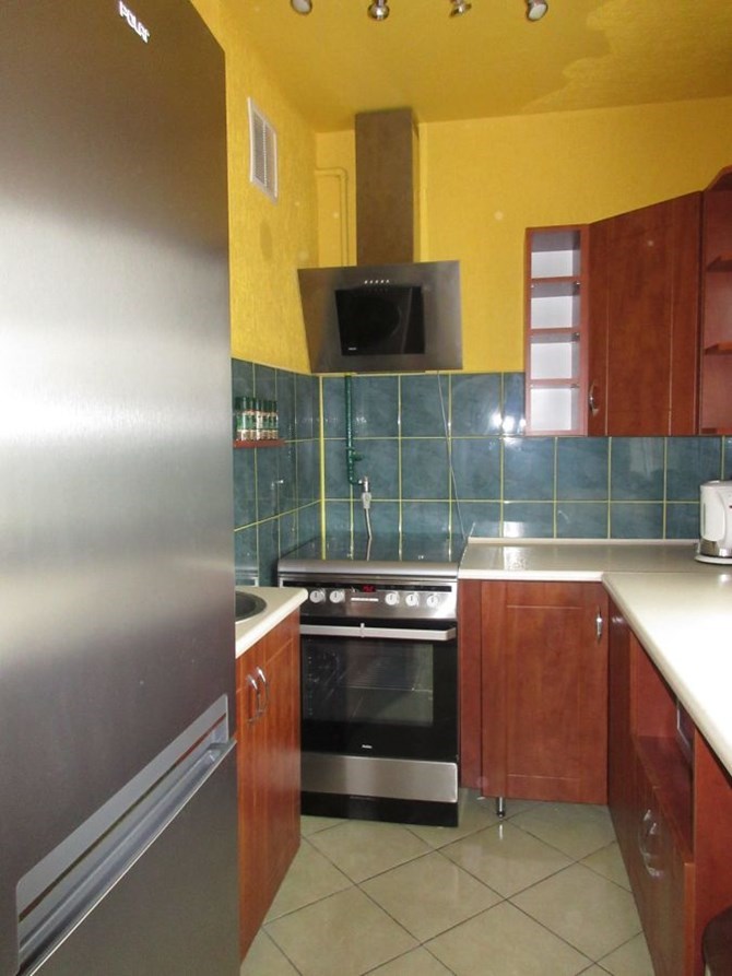 Kuchnia: lodówka, szafki, kuchenka gazowa czteropalnikowa z piekarnikiem elektrycznym i elektryczny okap.