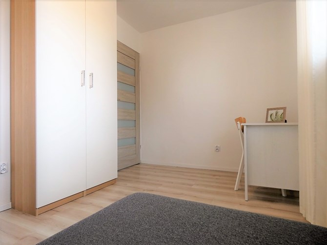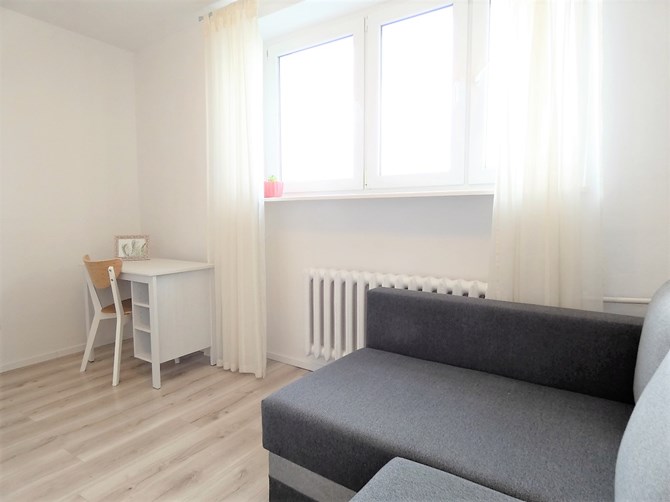 Pokój: kanapa rozkładana, biurko, szafa.