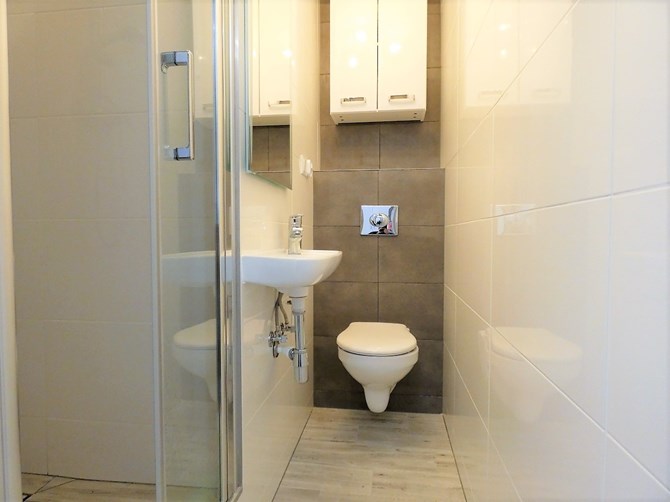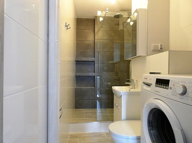 Łazienka 1 i 2: prysznic, umywalka, WC + pralka w jednej.