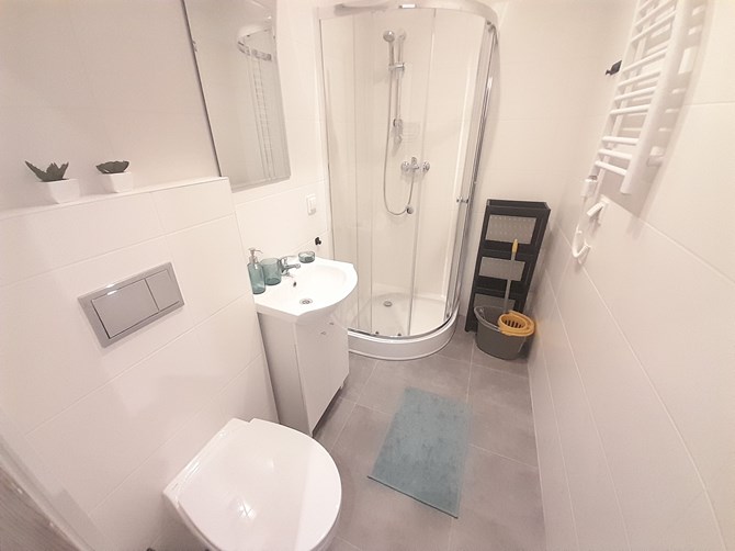 Łazienka z WC: kabina prysznicowa, umywalka, szafka, lustro