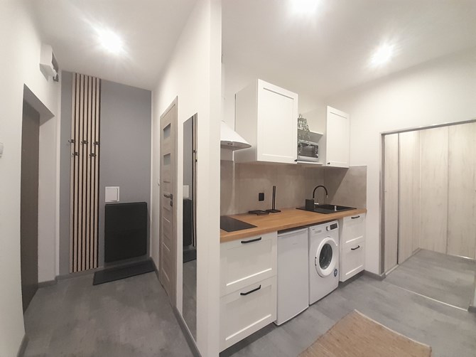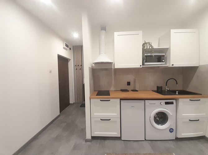 Aneks kuchenny: szafki, płyta elektryczna, mikrofala, lodówka, pralka