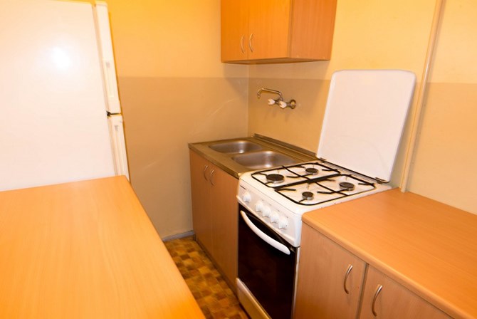 Kuchnia: szafki wiszące i stojące, blat, czteropalnikowa kuchenka gazowa z piekarnikiem, lodówka.