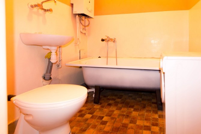 Łazienka z WC: toaleta, umywalka, wanna, pralka.