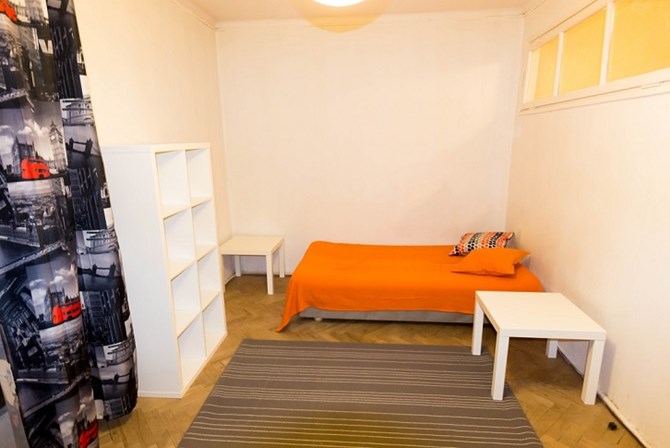 Pokój: regał, szafa, dwa stoliki nocne/kawowe, stół z dwoma krzesłami, rozkładana kanapa z pojemnikiem na pościel, dywan.