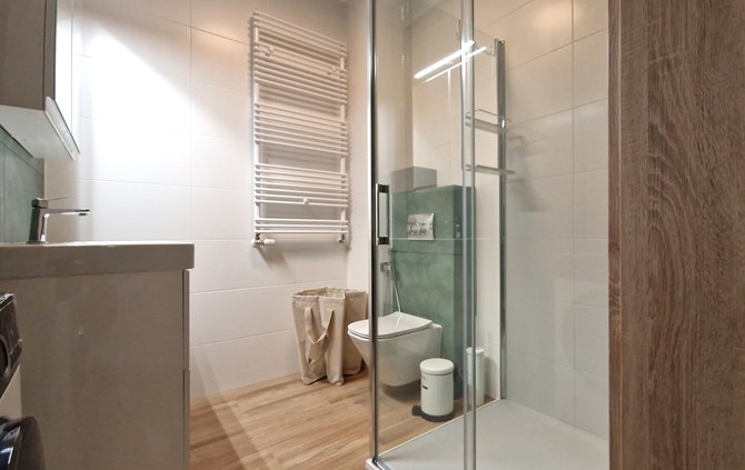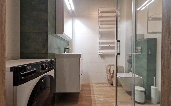 Łazienka: kabina prysznicowa, pralka, wisząca szafka, umywalka, WC.