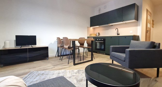Pokój z aneksem kuchennym: szafki, lodówka, piekarnik, płyta czteropalnikowa, zmywarka, zlewozmywak, okap, stół + 4 krzesła, stolik, rozkładana sofa, fotel ,komoda, szafa, telewizor, pralko-suszarka i wentylator sufitowy.
