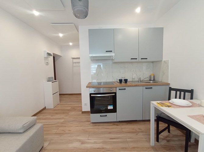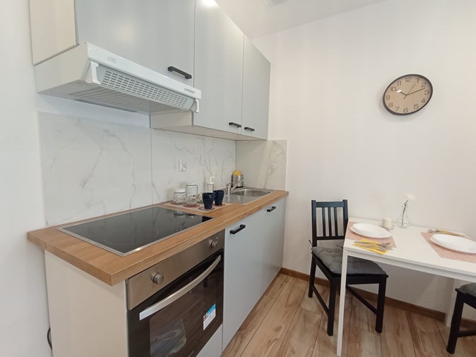 Aneks kuchenny: szafki, płyta elektryczna, piekarnik, lodówka.