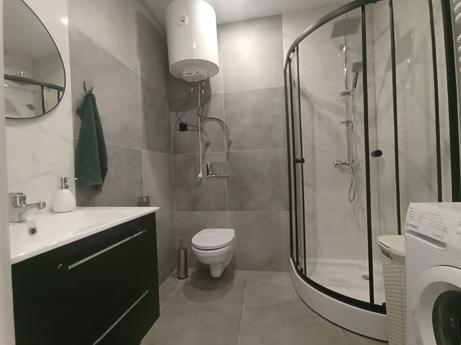 Łazienka z WC: kabina prysznicowa, umywalka, szafka, lustro, pralka.