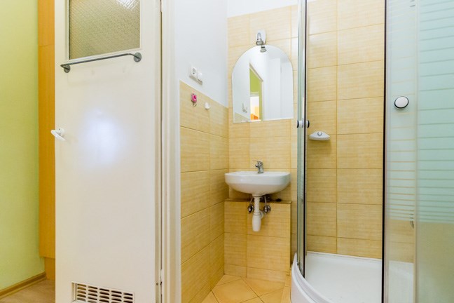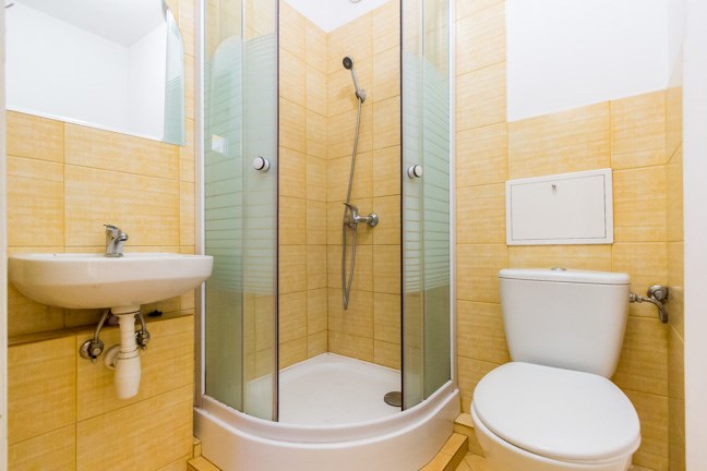 Łazienka: kabina prysznicowa, umywalka, WC.