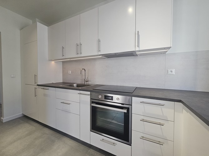 Aneks kuchenny: szafki, lodówka, płyta indukcyjna, piekarnik, zmywarka, zlewozmywak, okap.
