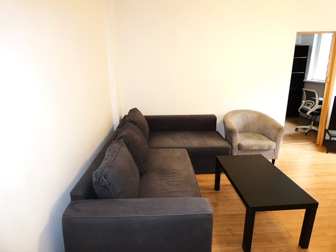 Pokój 1: rogówka z funkcją spania, fotel, stolik, stolik RTV, telewizor.