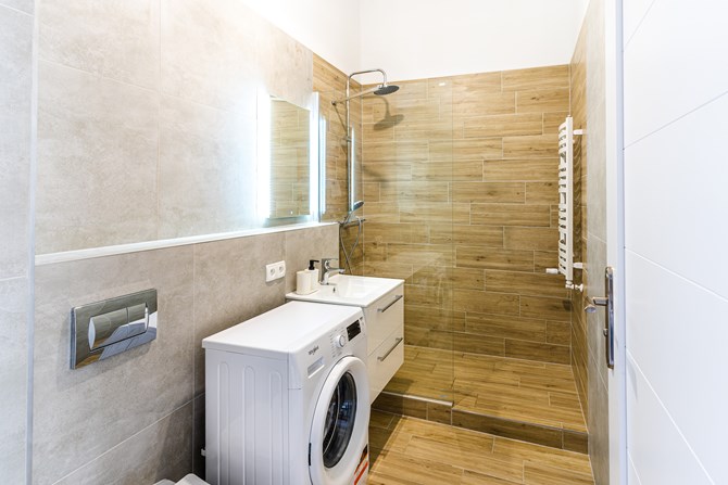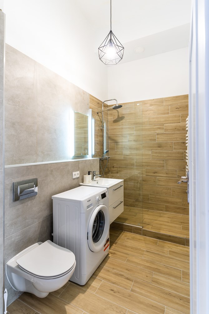 Łazienka razem z WC: kabina prysznicowa, pralka, lustro, umywalka, szafka.