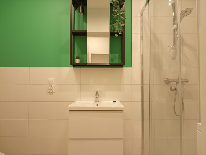 Łazienka z WC: kabina prysznicowa, pralka, umywalka.