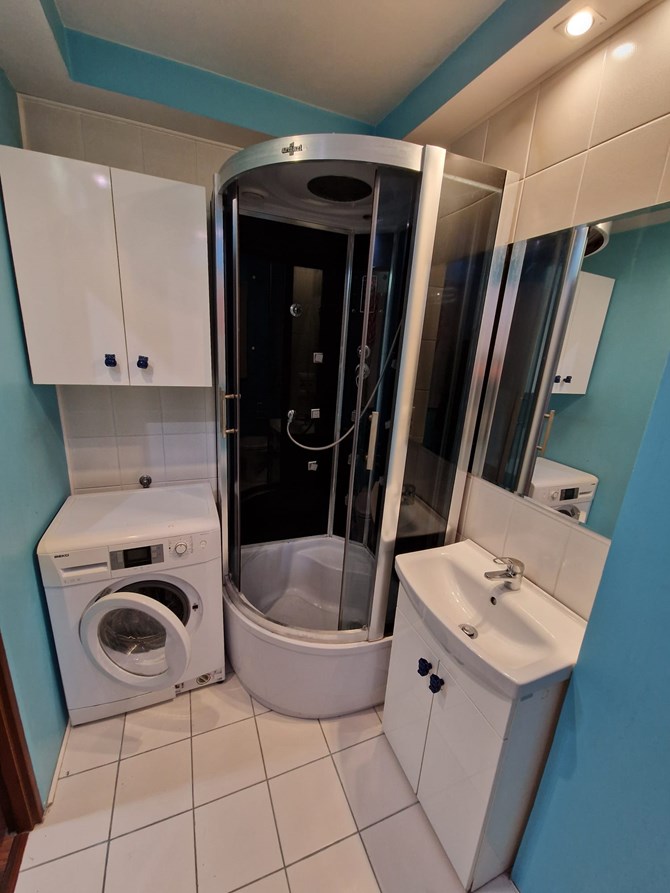 Łazienka razem z WC: kabina prysznicowa, pralka, wisząca szafka, lustro, umywalka.