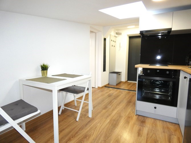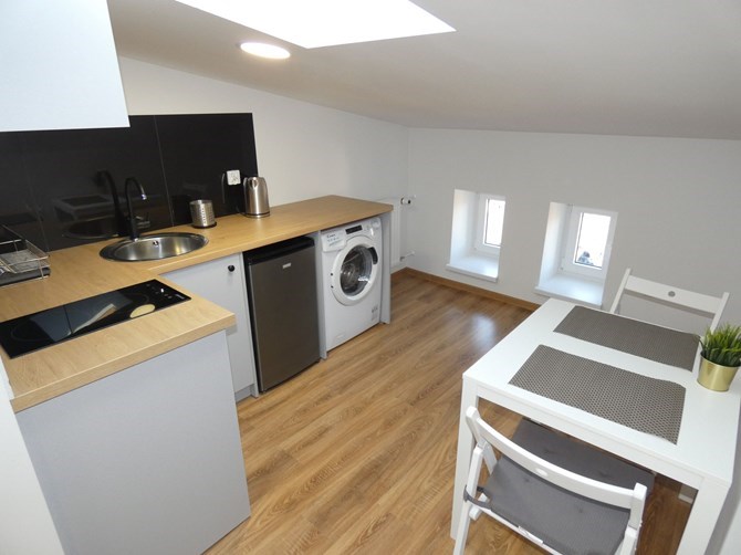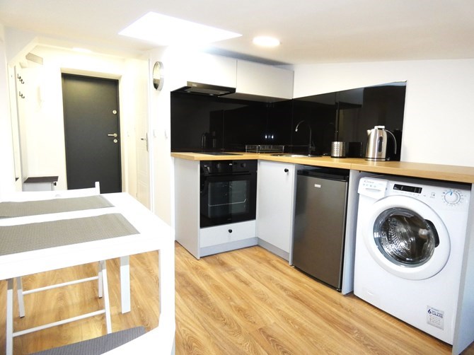 Pokój z aneksem kuchennym: szafki kuchenne, pralka, lodówko-zamrażarka, zlewozmywak, okap, piekarnik, płyta indukcyjna 2 palnikowa i czajnik elektryczny.