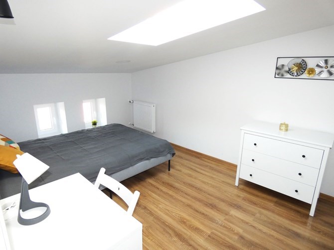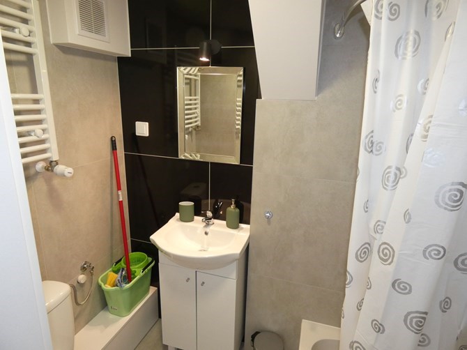 Łazienka: prysznic, umywalka, WC + ogólnodostępna pralnia na piętrze.