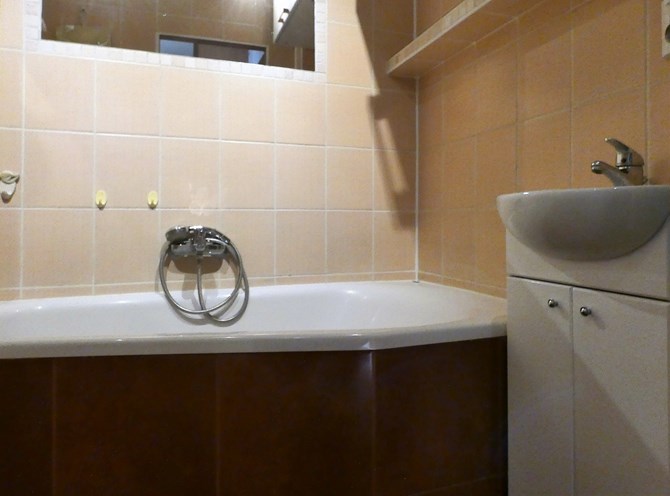 Łazienka: wanna, szafka, umywalka, lustro.