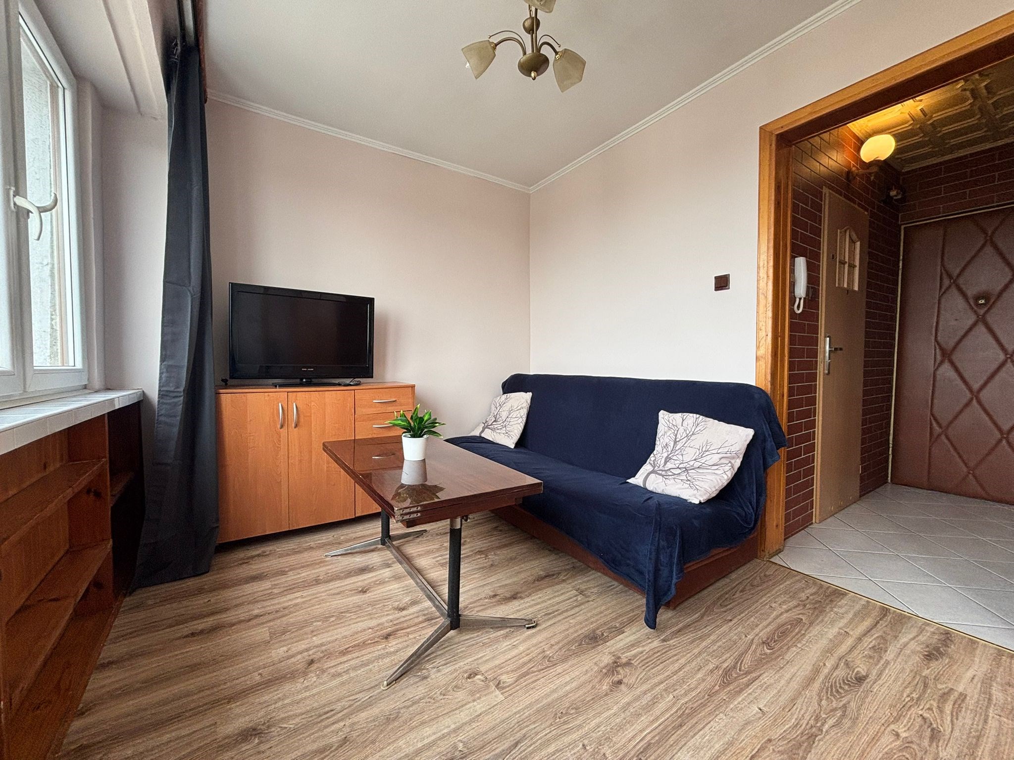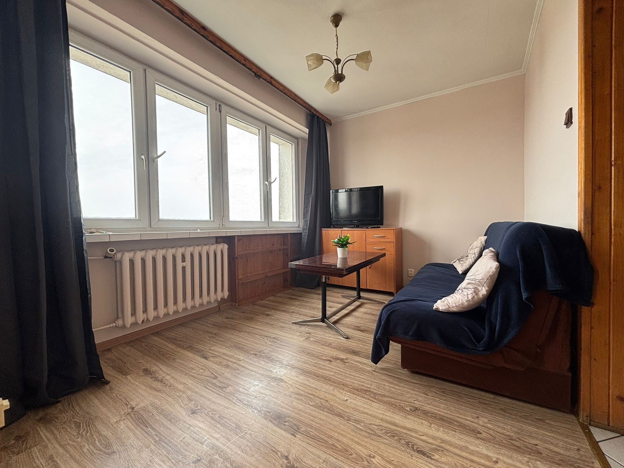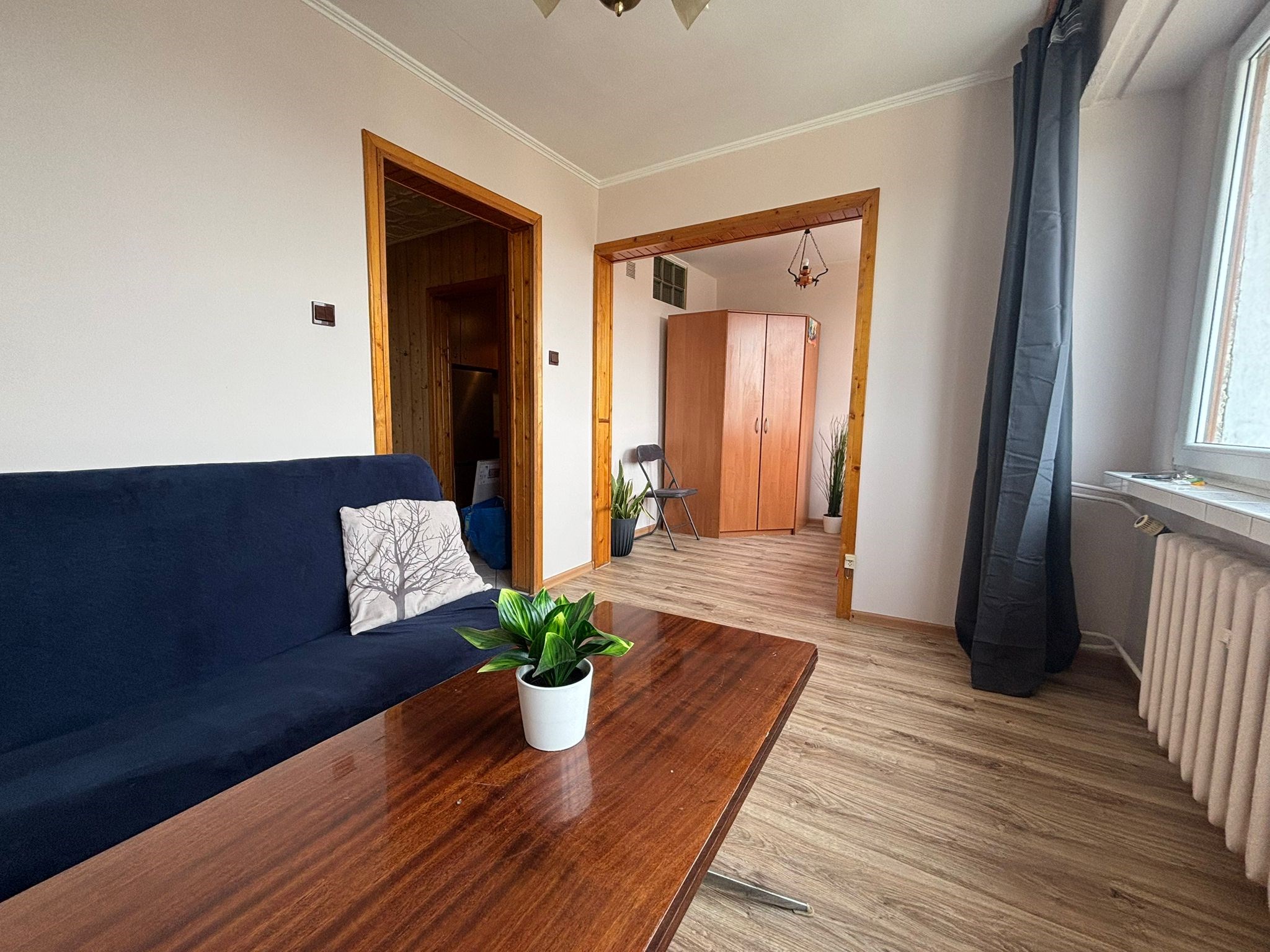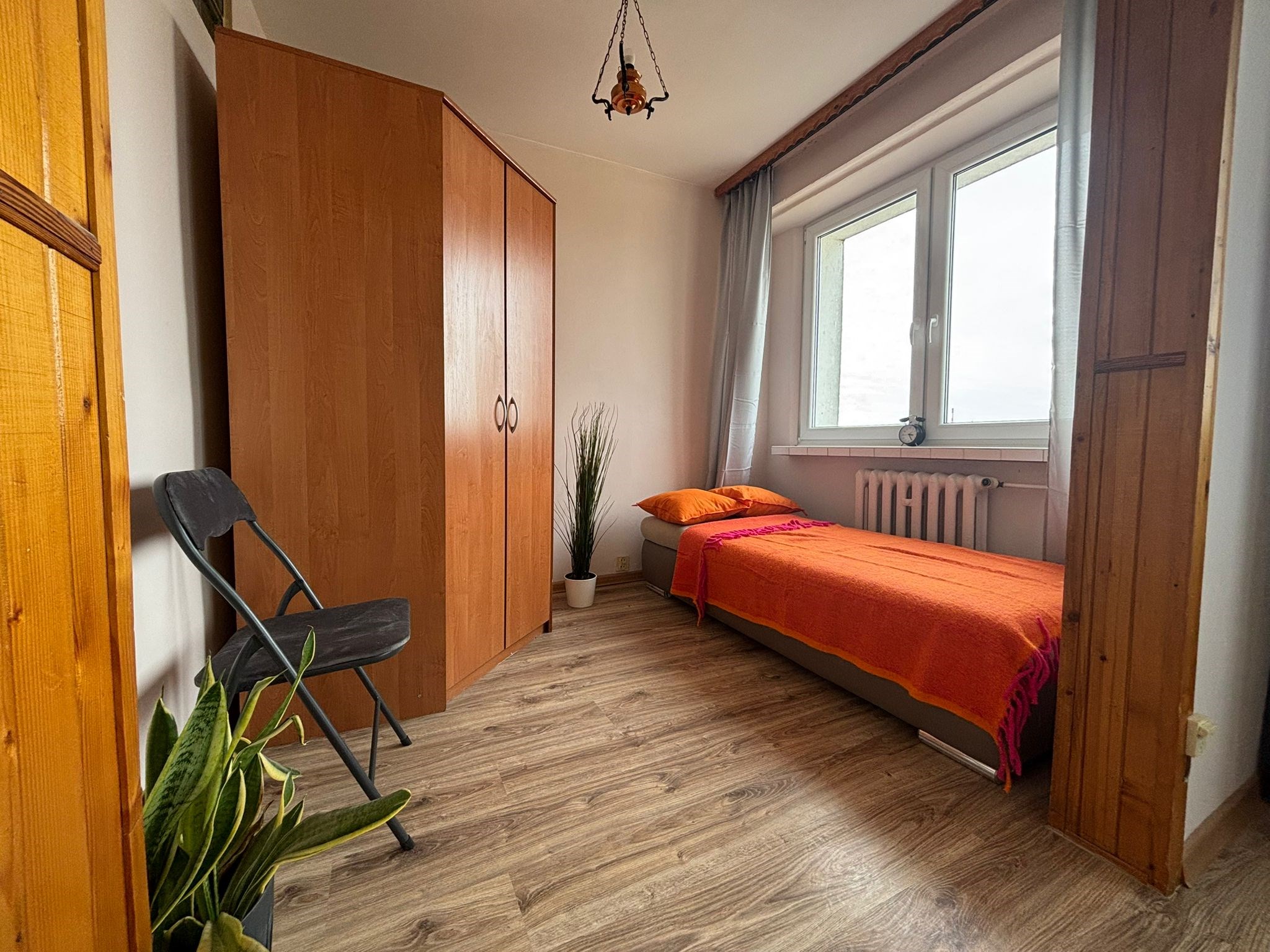 Pokój: pojemna szafa, komoda, rozkładana kanapa dwuosobowa z pojemnikiem na pościel.