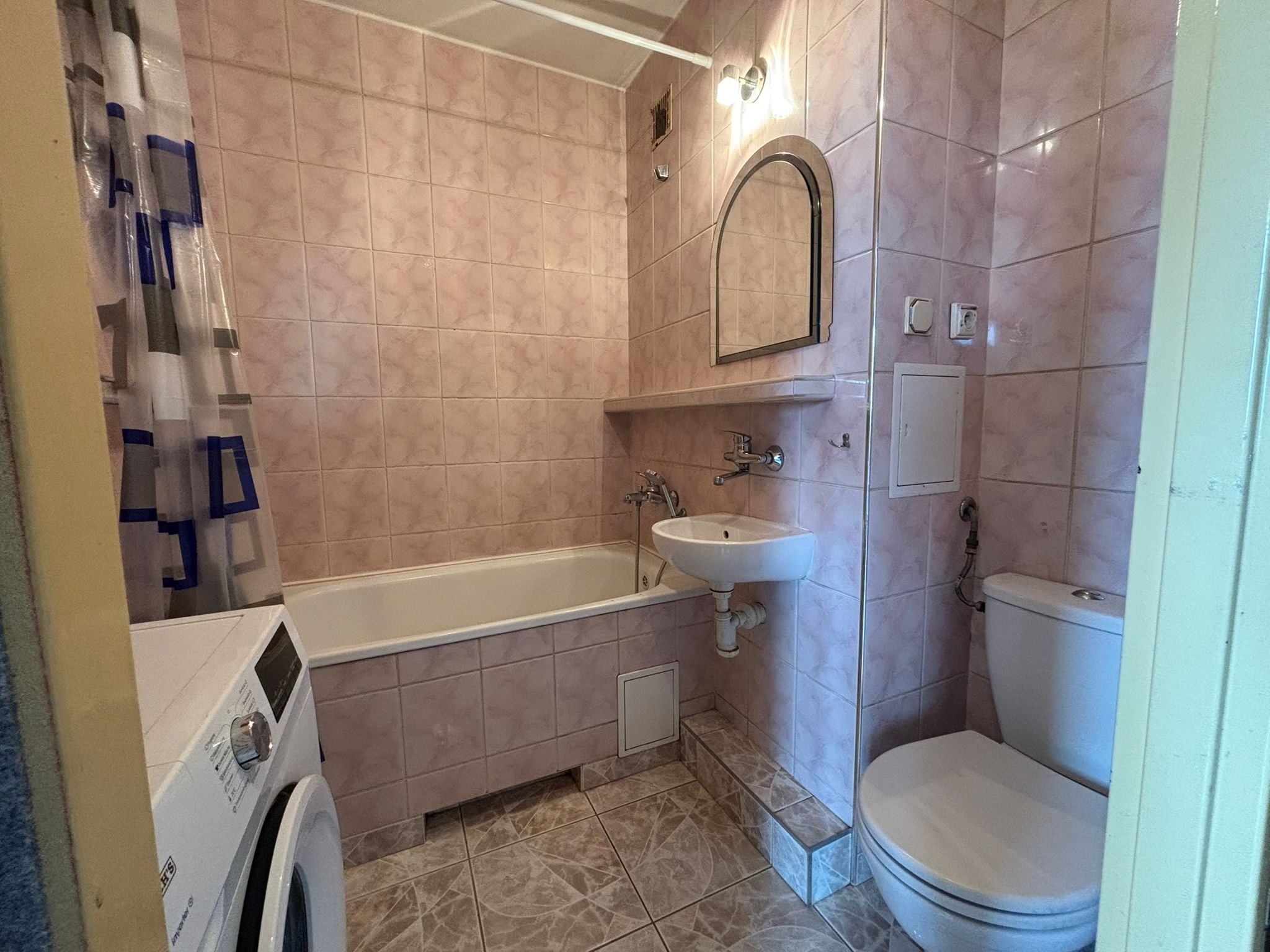 Łazienka: wanna, umywalka, WC, pralka.