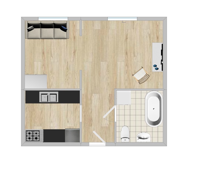 Funkcjonalny układ: pokój, osobna kuchnia i łazienka.