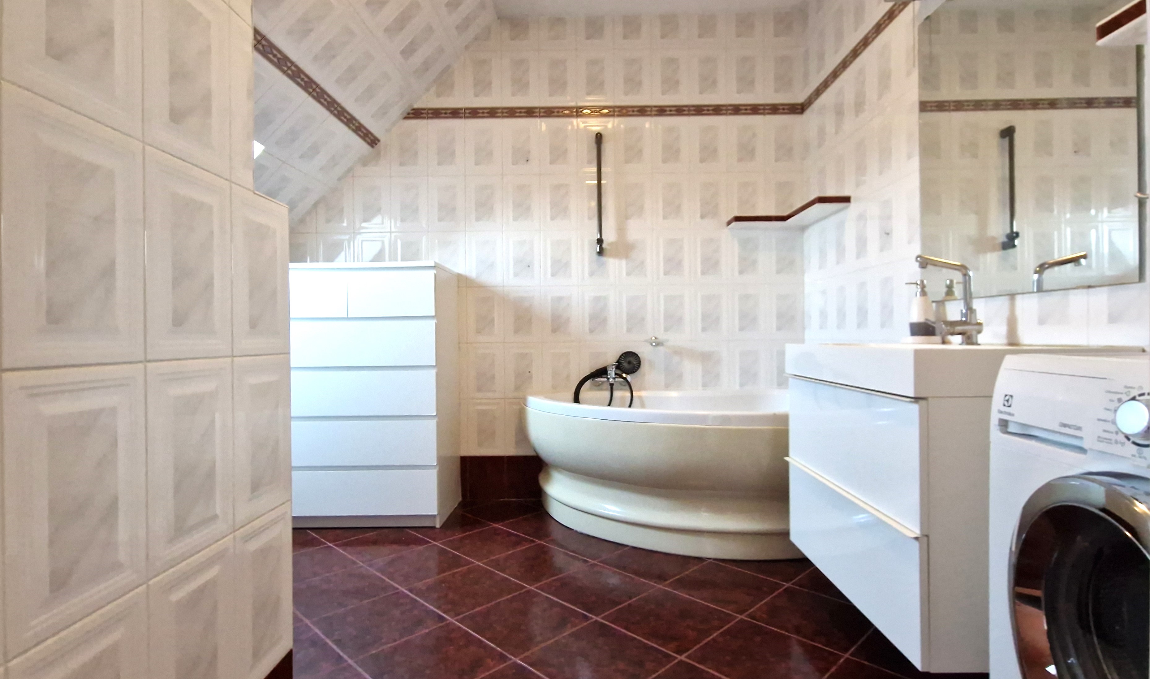 Łazienka (razem z WC): wanna, pralka, komoda, umywalka, lustro, szafki, kaloryfer.