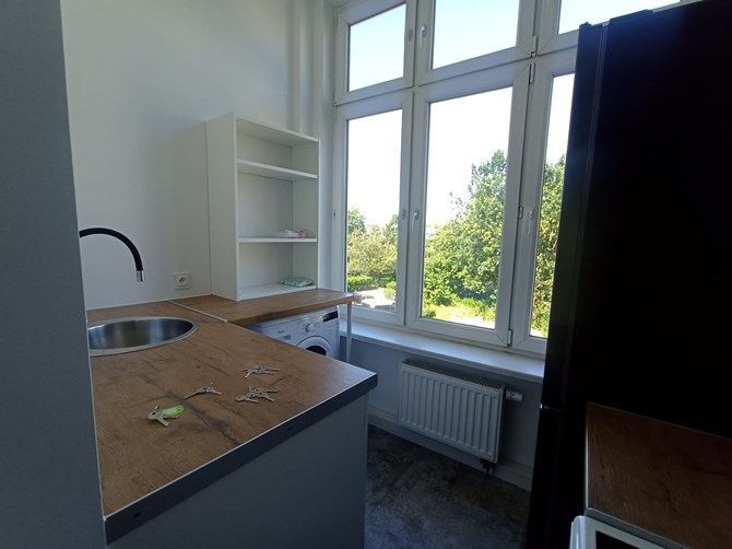 Mieszkanie składa się z osobnego pokoju, w pełni wyposażonego aneksu kuchennego, łazienki z kabiną prysznicową oraz oddzielnego WC.