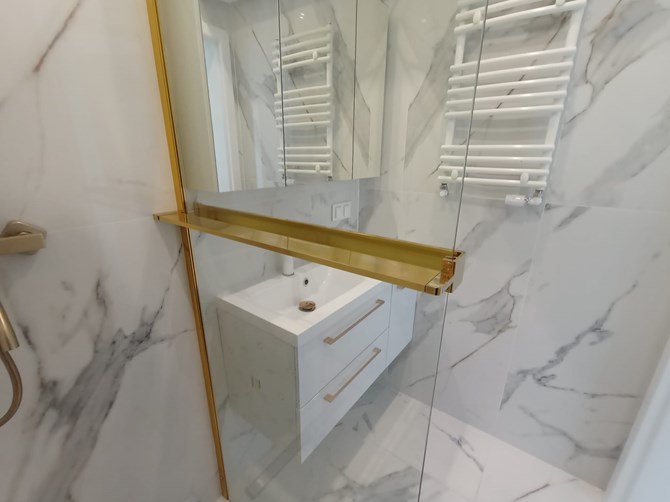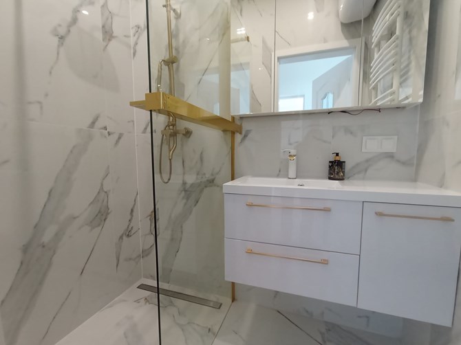 Łazienka: kabina prysznicowa, szafka, umywalka.