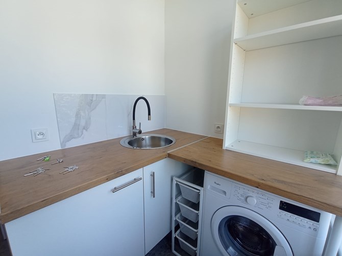 Kuchnia: meble, kuchenka elektryczna, pralka, lodówka.