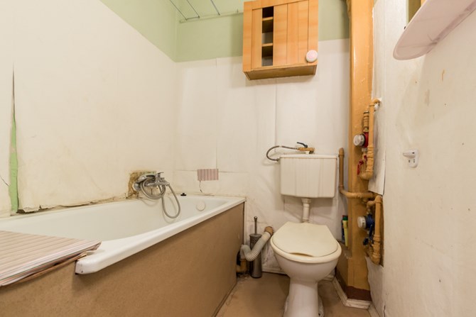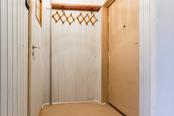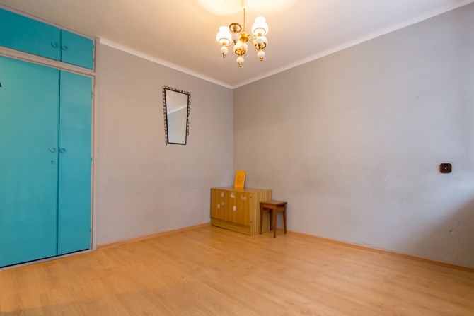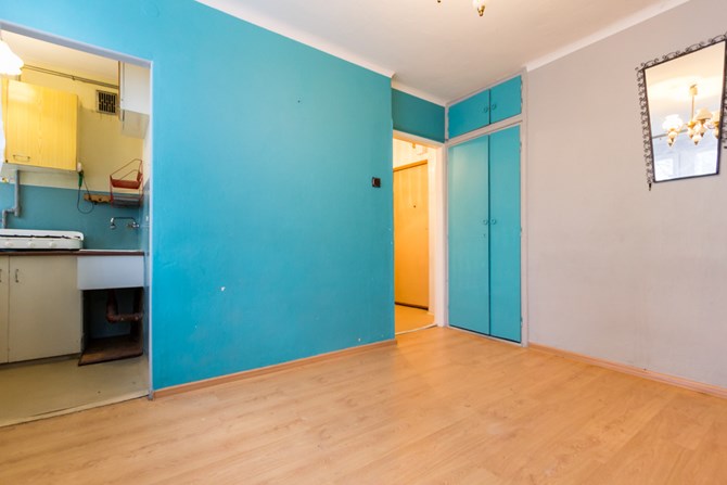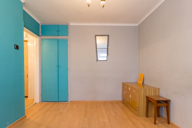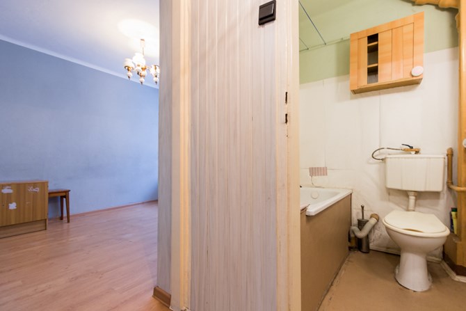 Wchodząc do mieszkania, na wprost znajduje się łazienka z WC, a na lewo przestronny pokój z szafą wnękową.