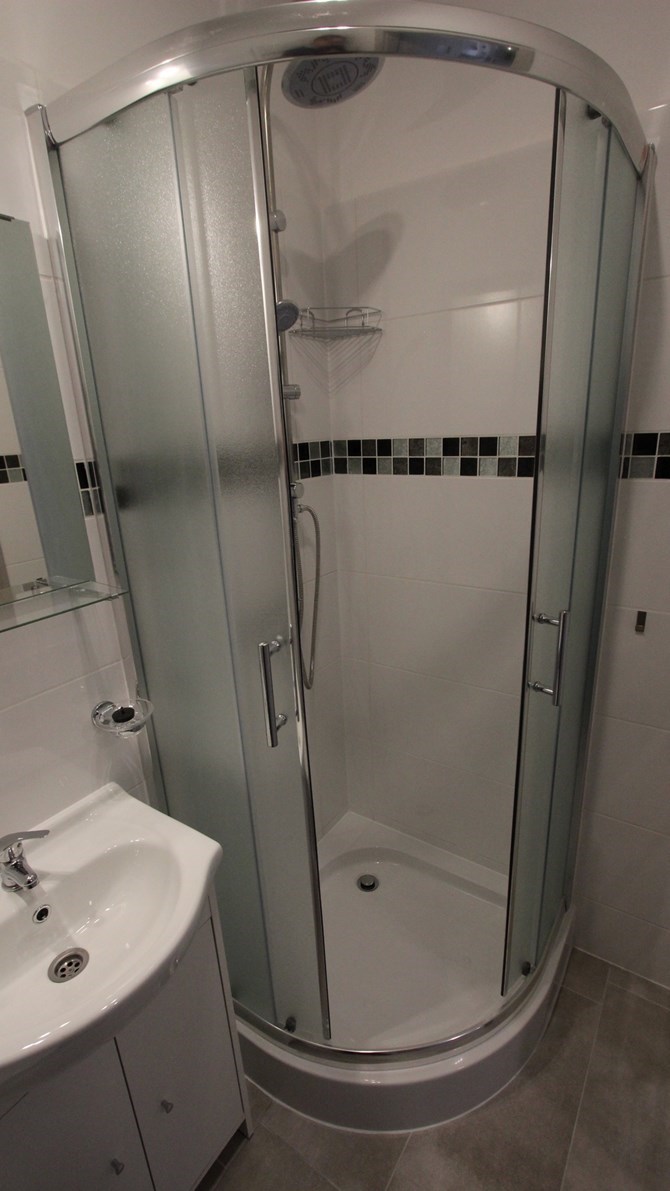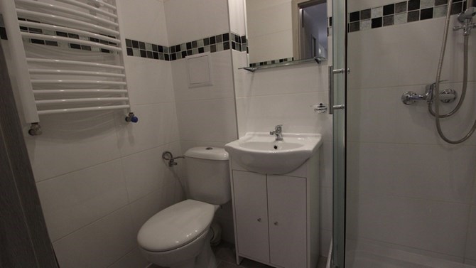 W mieszkaniu znajdują się wspólne 2 łazienki oraz aneks kuchenny.