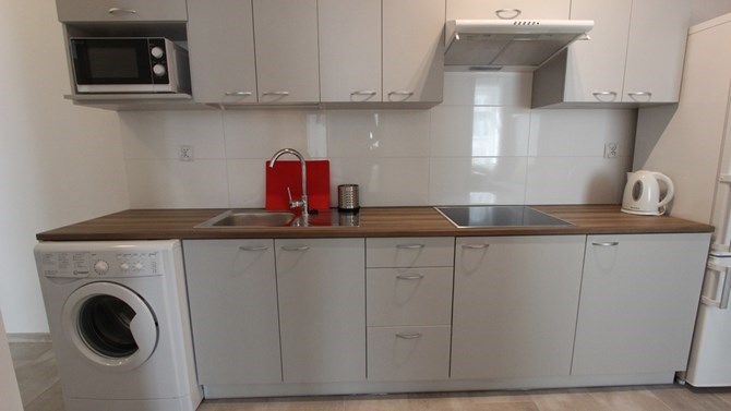 Aneks kuchenny: szafki kuchenne, okap, kuchenka elektryczna, mikrofala, lodówka z zamrażalnikiem, zlew, pralka.