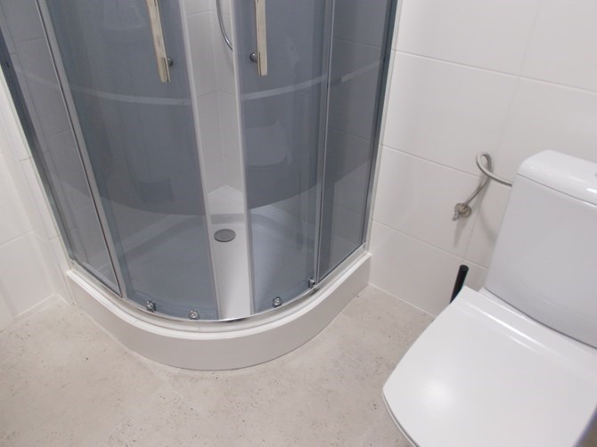 Łazienka: zlew, szafka, pralka, WC, kabina prysznicowa.