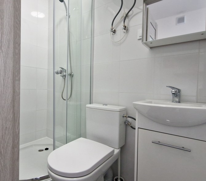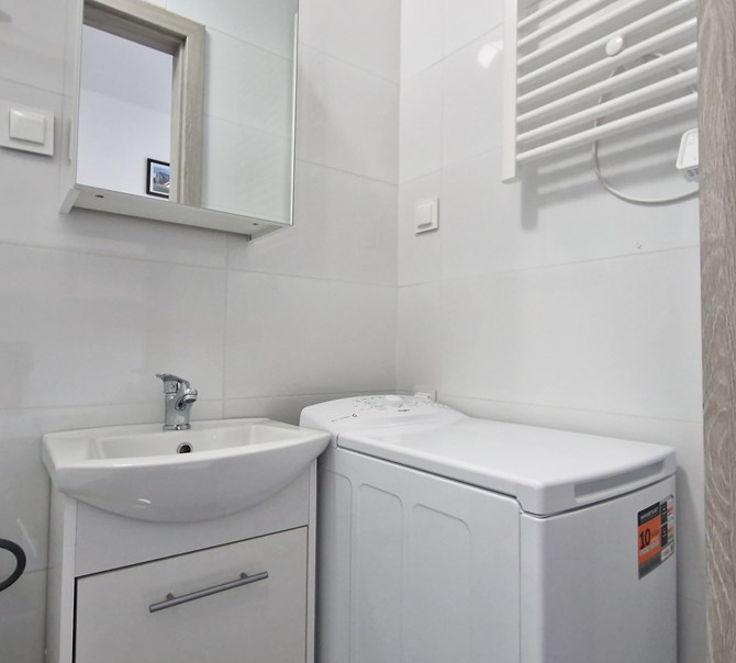 Łazienka (razem z WC): kabina prysznicowa, lustro, umywalka, szafka, pralka, wiszący kaloryfer, bojler.