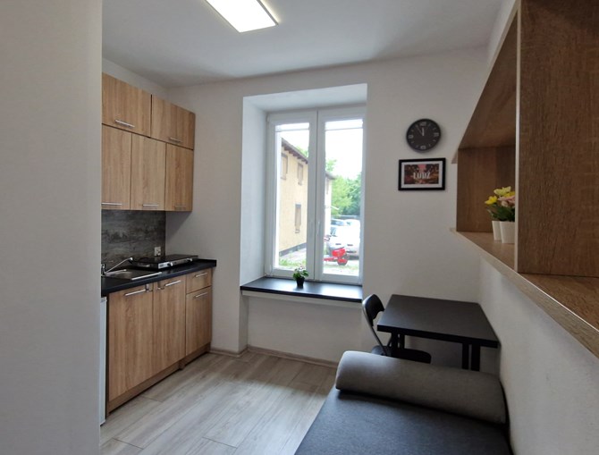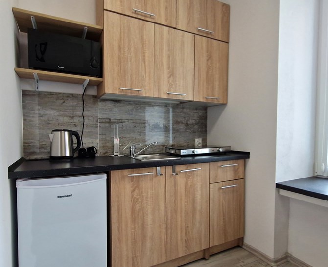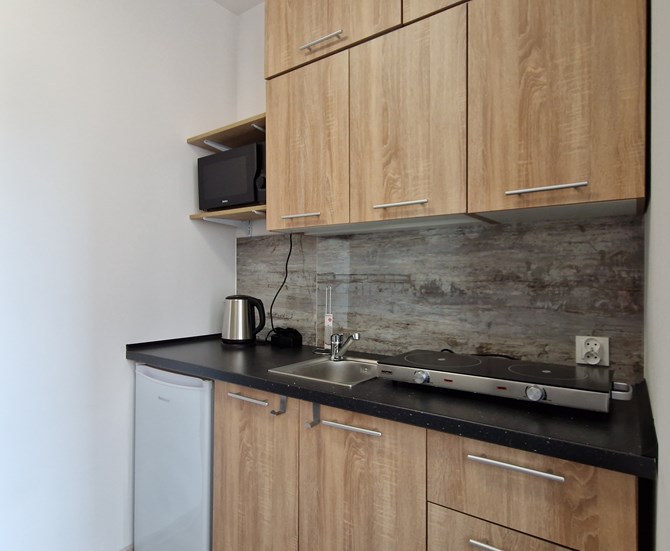 Pokój z aneksem kuchennym: szafa, rozkładana kanapa, szafki, stół, krzesło, płyta grzewcza (2 pola), lodówka, zlewozmywak, kuchenka mikrofalowa.