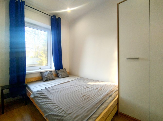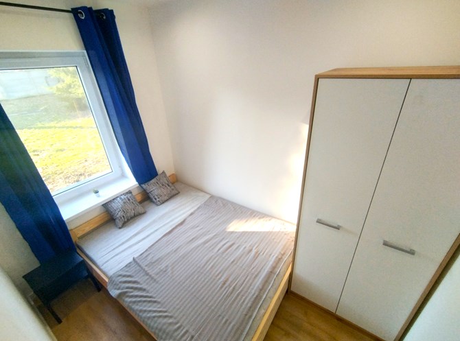 Sypialnia: łóżko podwójne, szafa, szafka nocna