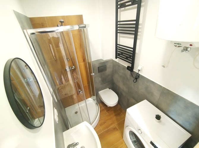 Łazienka razem z WC: kabina prysznicowa, lustro