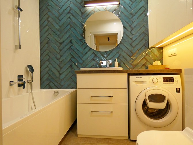 Łazienka: wanna, szafki, umywalka, pralka, WC.