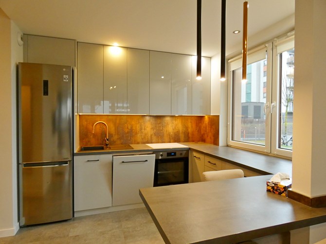 Aneks kuchenny: szafki wiszące i stojące w zabudowie, blat z wysokimi krzesłami, lodówko-zamrażarka, zmywarka, piekarnik, płyta indukcyjna, okap, zlew.