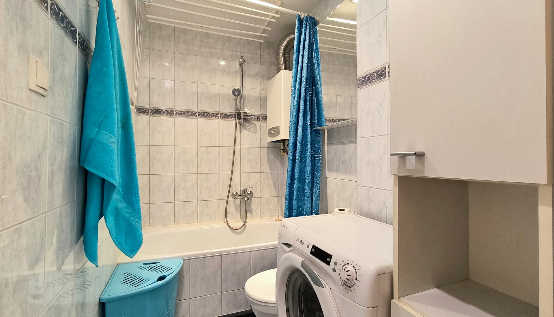 Łazienka z wanną z funkcją prysznica oraz WC.