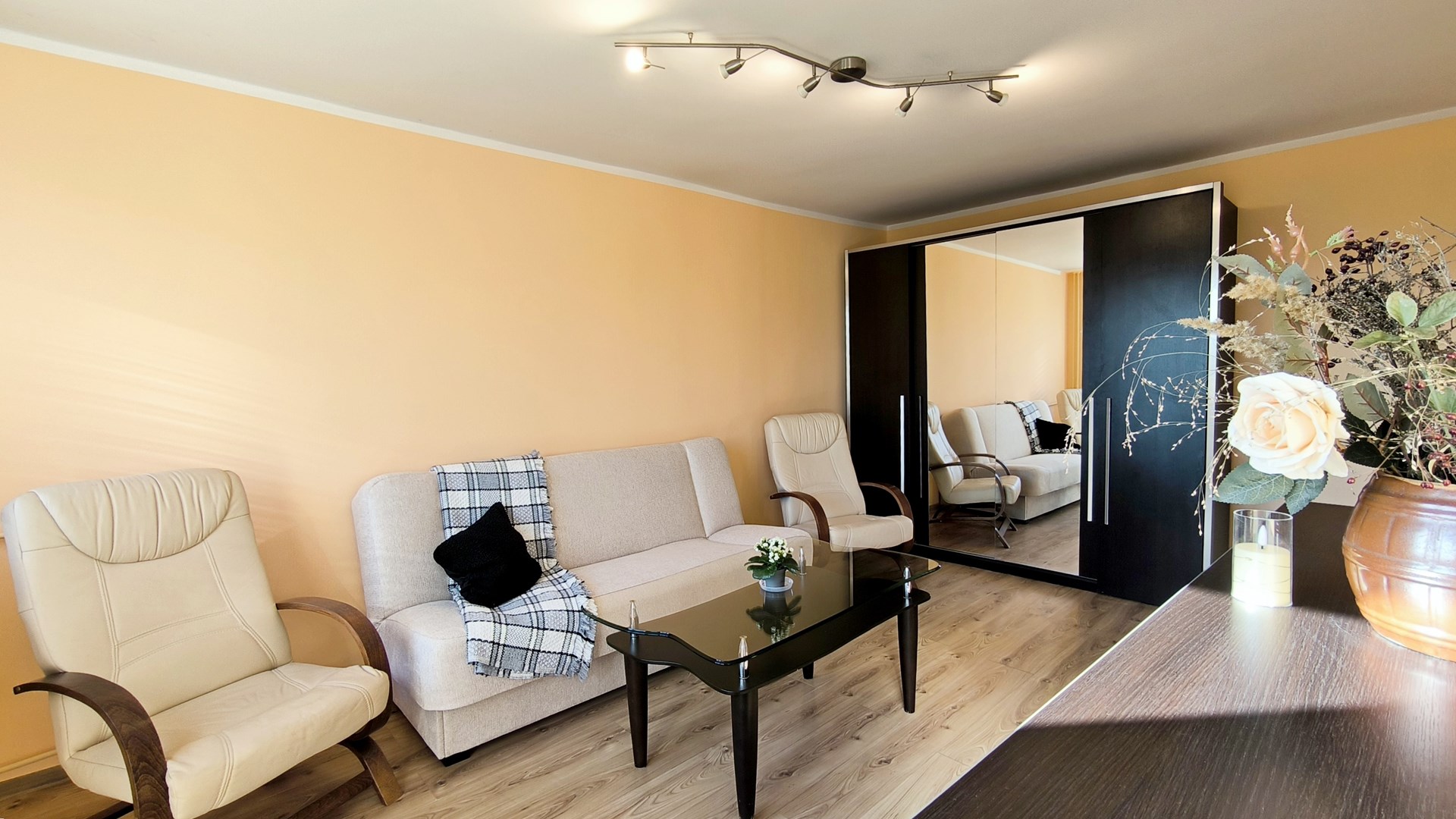 Salon: kanapa rozkładana, 2 fotele, ława, komoda, szafa 4D.