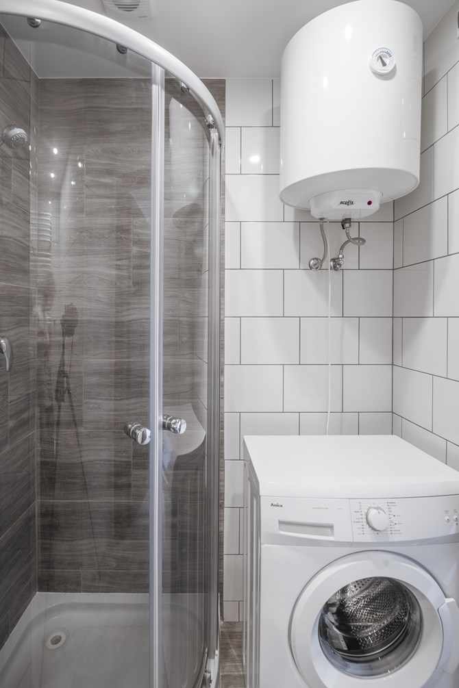 Łazienka z WC: kabina prysznicowa, pralka, umywalka z szafką łazienkową.